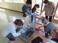 昨年の7月に核入れさせていただいた真珠の母貝を、いよいよ浜上げ作業しました。前PTA会長のKさんの御指導で、母貝の中から真珠を取り出します。Kさん曰く、貝の真ん中に核が入っていると、きれいな真珠ができているとのこと。今年の出来具合はどうだったでしょうか?