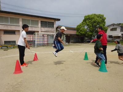 鉄棒運動、縄跳び、駆け足、リレー、鬼ごっこなど、実に様々な運動を取り入れています。