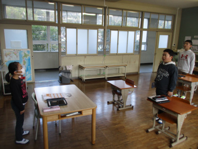 授業風景~持久走練習 2023年12月8日 12時32分 ■2年生 算数 テスト 学期末のテストに集中して取り組んでいます。 かけ算の問題がありました。 「ノートを9人に配ります。1人に3冊ずつ配ると、何冊いりますか。」という問題です。 かける数とかけられる数が反対になりやすいところですが、確実に3×9という式を導き出していました。 学習内容が確実に定着している証拠です。 ■3年生 国語 テスト こちらもテストです。 ちゃんと見直しをしています。 裏面には言語に関する問題が並んでいます。 こちらが確実にできるようにることは、力が付いていることの一つの表れです。 本校の教育アドバイザーである椿原先生から学びました。 ■5年生 外国語 日本人ALTの先生が来られて学習しています。 この日のダイアローグは、 What would you like? I'd like ○○. How much? It's ○○yen. です。 お金のカードを数えながら、 Two hundred and fifty yen. などの、何百何十円というときの言い方を学んでいます。 ■持久走練習 放課後は3人で持久走練習をして体力づくりに励んでいます。 先日、清家勲先生に教えていただいたことを元にして、練習を組み立てています。 ラダーを活用して様々な動きに取り組んでいます。 この日は、トラックを逆向きに走っていました。