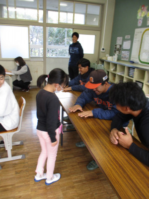 United Culture School! ~英語でのやり取りを楽しむ~ 2023年11月14日 16時09分 14日(火)は、UCSの皆さんも来てくださいました。 UCSとは、United Culture Schoolの頭文字を取ったものです。 来てくださったのは、西川さんとRenさんです。 Renさんが中心になって進めてくださるので、もちろんAll Englishです。 子どもたちは一生懸命聞き取りながら説明を理解し、やり取りしていきます。 フラッシュカードを使ってかるたをしたり、少しだけ中身が見えるケースに入れて単語を当てたりして楽しみました。 いろいろな大きさのカードを、目隠ししたままフライ返しを使ってすくい上げるゲームも楽しみました。 最後は、新聞で包まれた大きなプレゼントを、手袋をしたまま開いていくゲームです。 なんと、新聞紙の包み紙が何重にもなっていて、開いてくと、秘密のプレゼントが時々出てくる仕掛けになっているのです。 このゲーム、とっても盛り上がりました。 最後はちょっと早めのクリスマスツリーを入れてみんなで記念撮影をしました。 UCSの西川さん、Renさん、ありがとうございました! 英語でのやり取り、とっても楽しかったです。